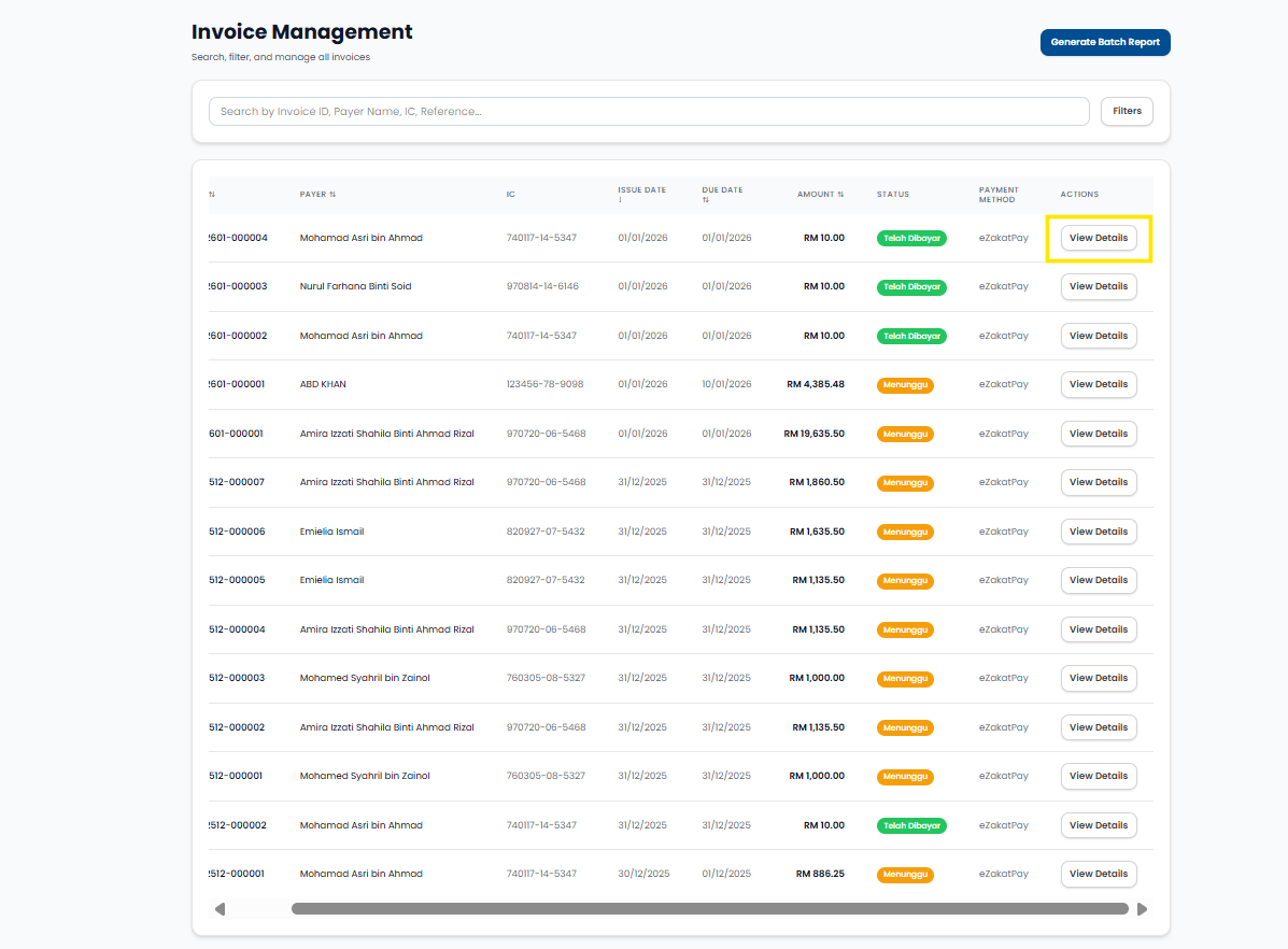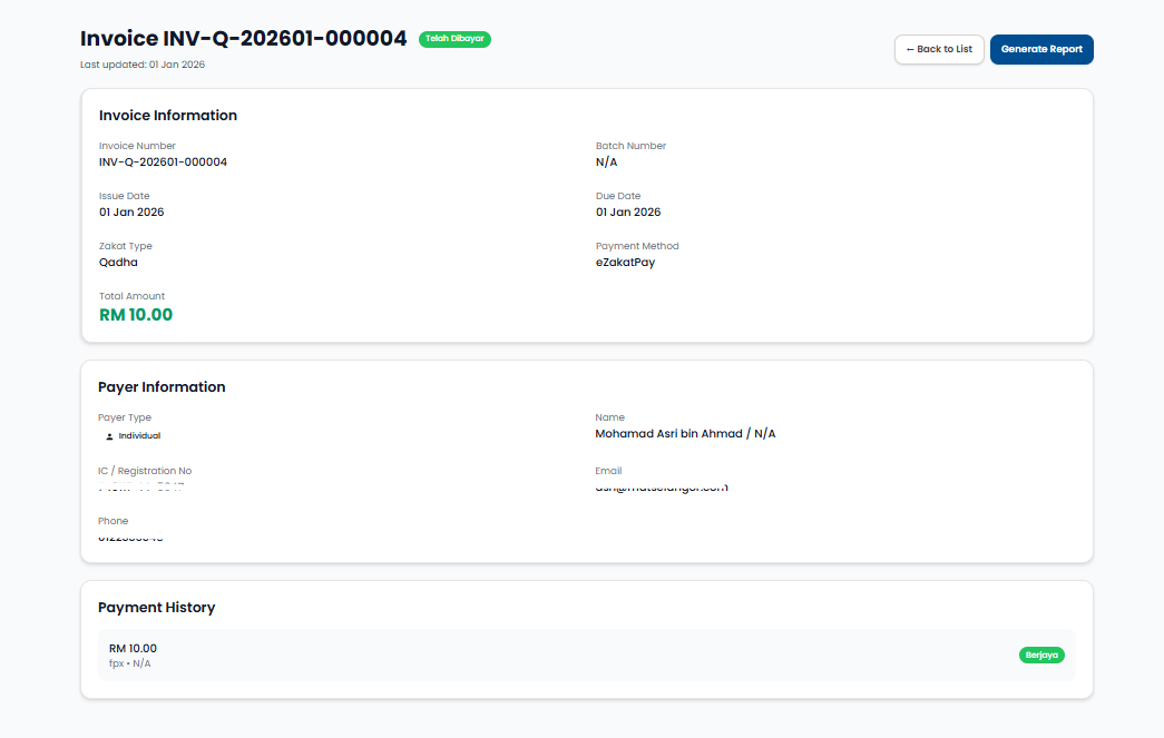 Langkah 2: Sistem menunjukkan paparan invois dengan maklumat lebih lanjut.