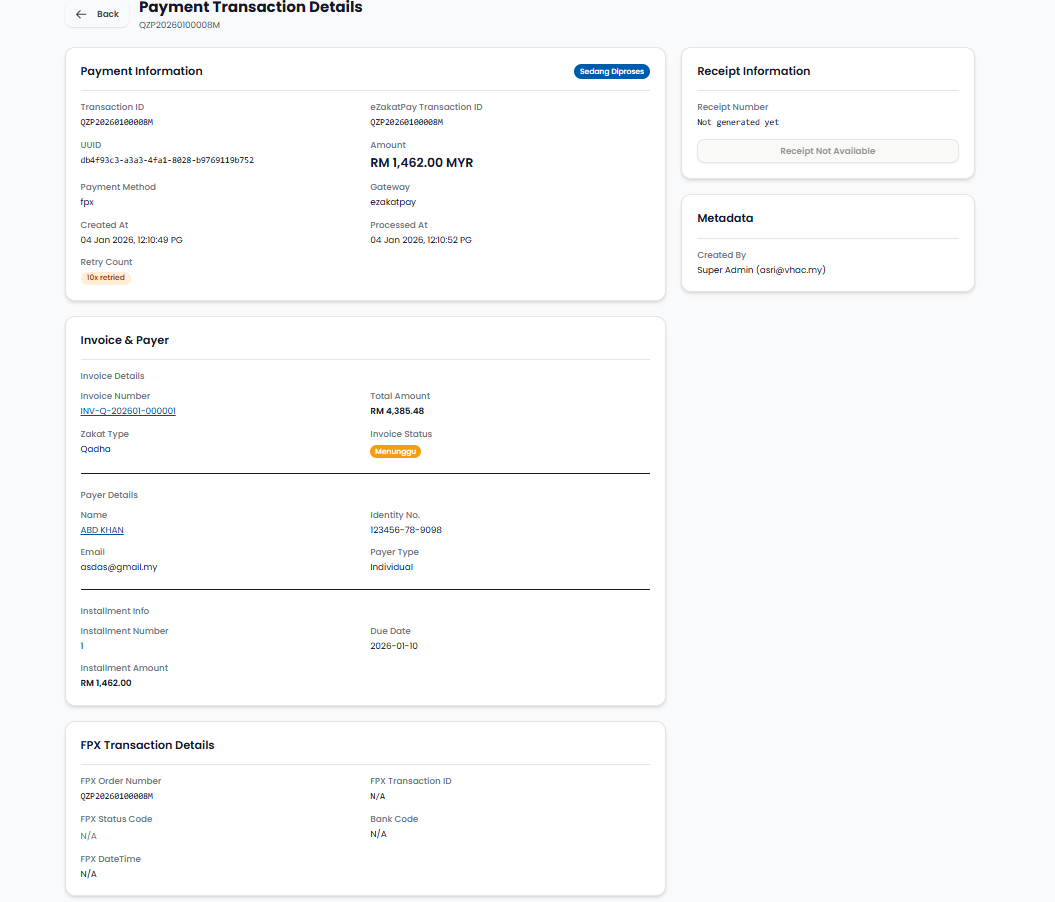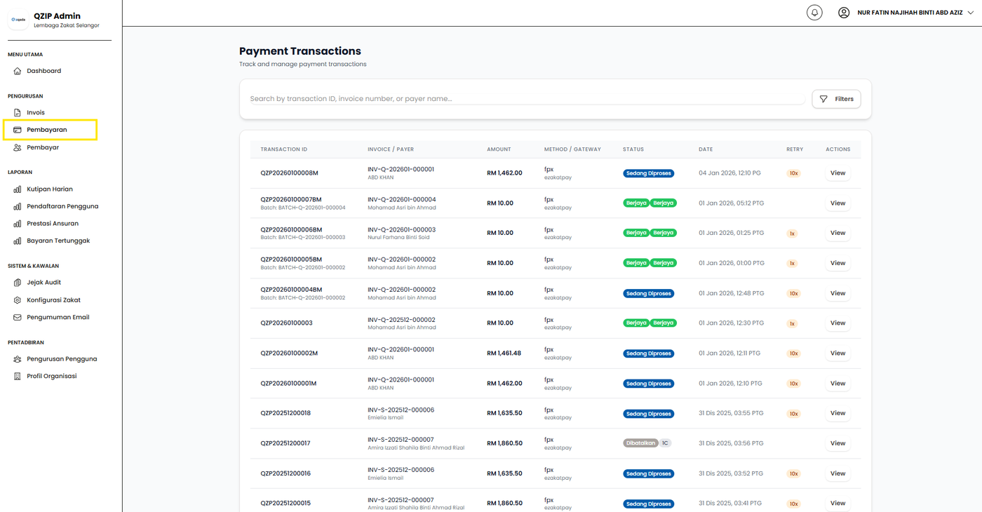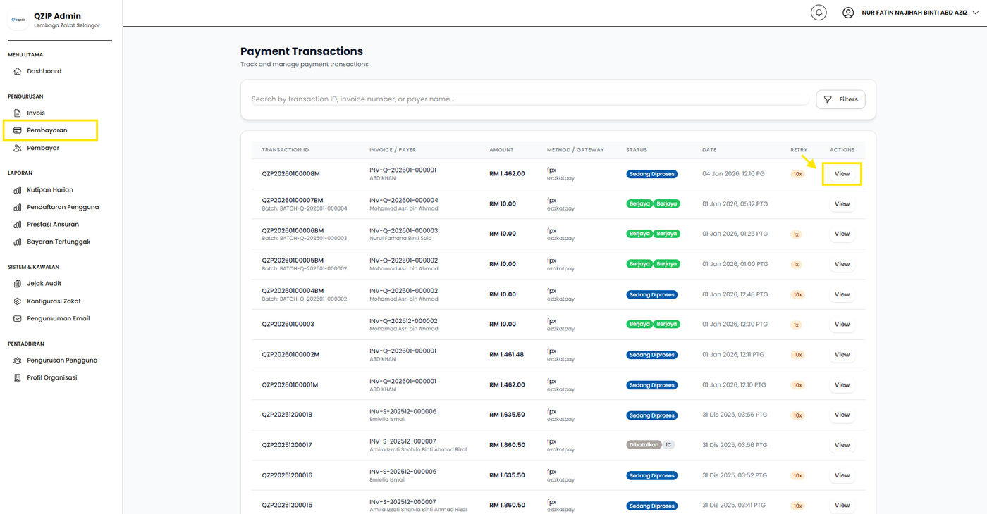 3.2 Pengurusan Pembayaran 3.2.1 Lihat Senarai PembayaranLangkah 1: Klik pada menu Pembayaran.Langkah 2: Klik View untuk lihat maklumat pembayaran dengan lebih lanjut.Langkah 3: Sistem akan memaparkan skrin maklumat pembayaran dengan lebih lanjut.