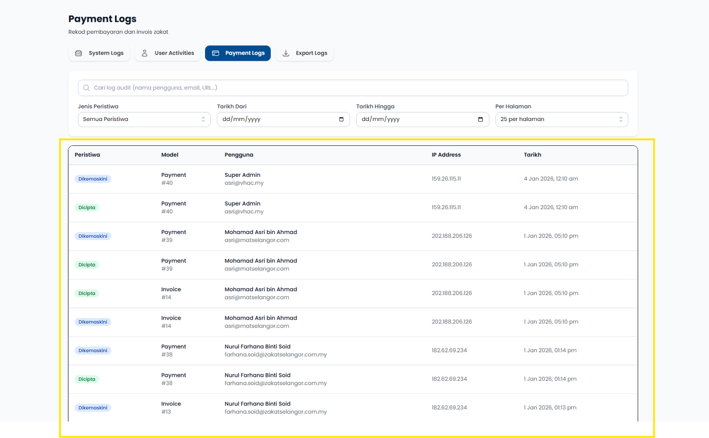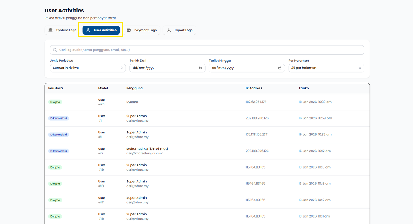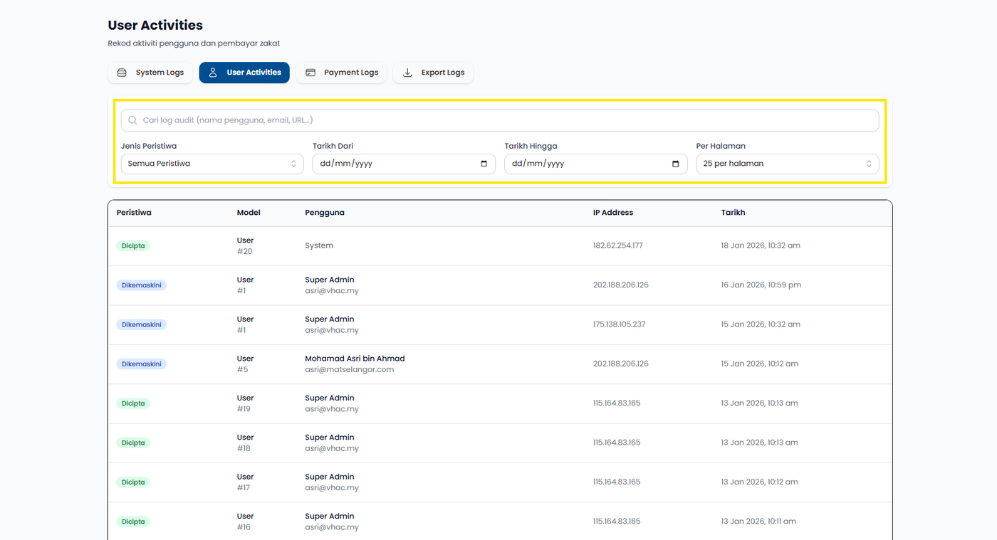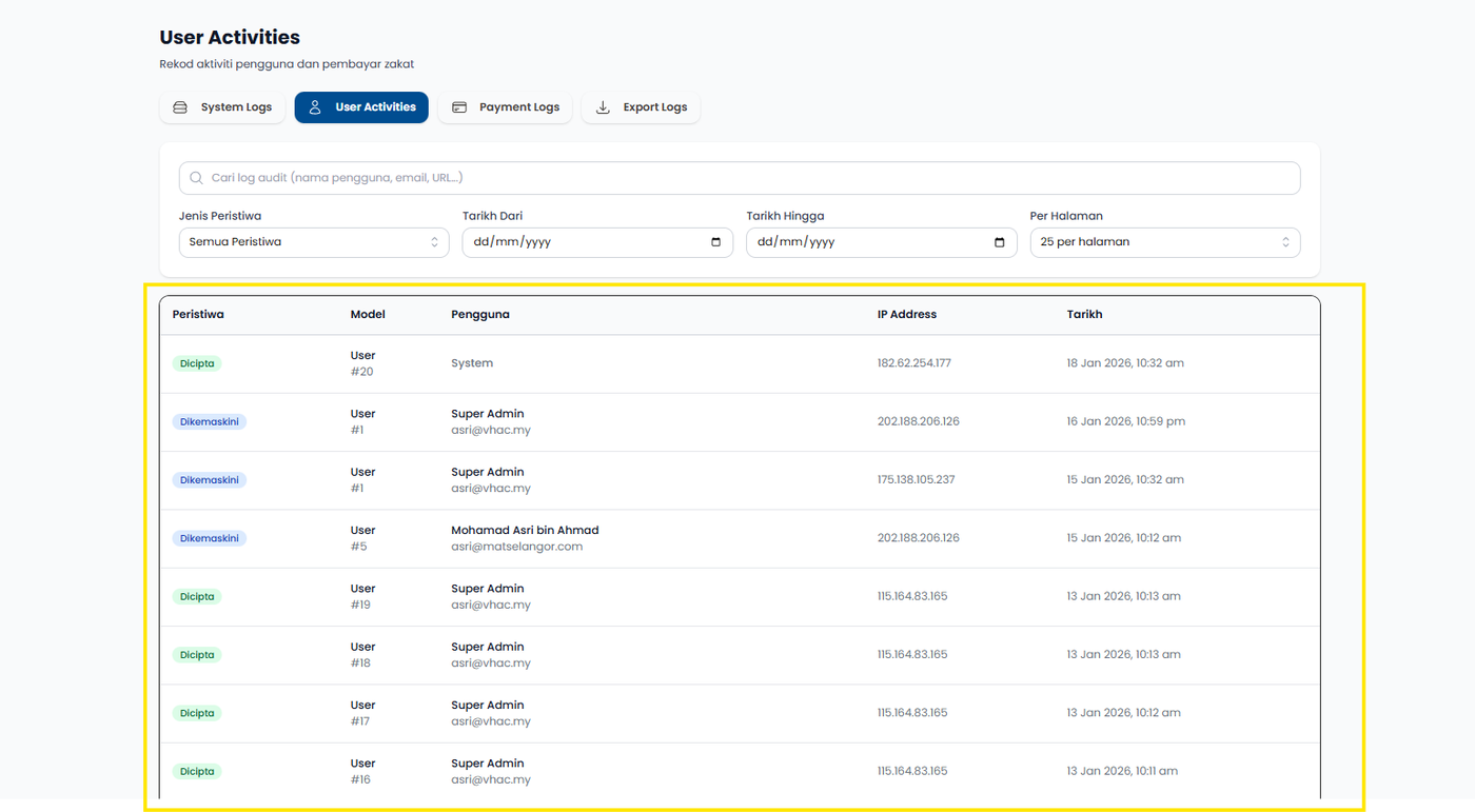 Langkah 3: Sistem memaparkan senarai rekod aktiviti pengguna dan pembayar.