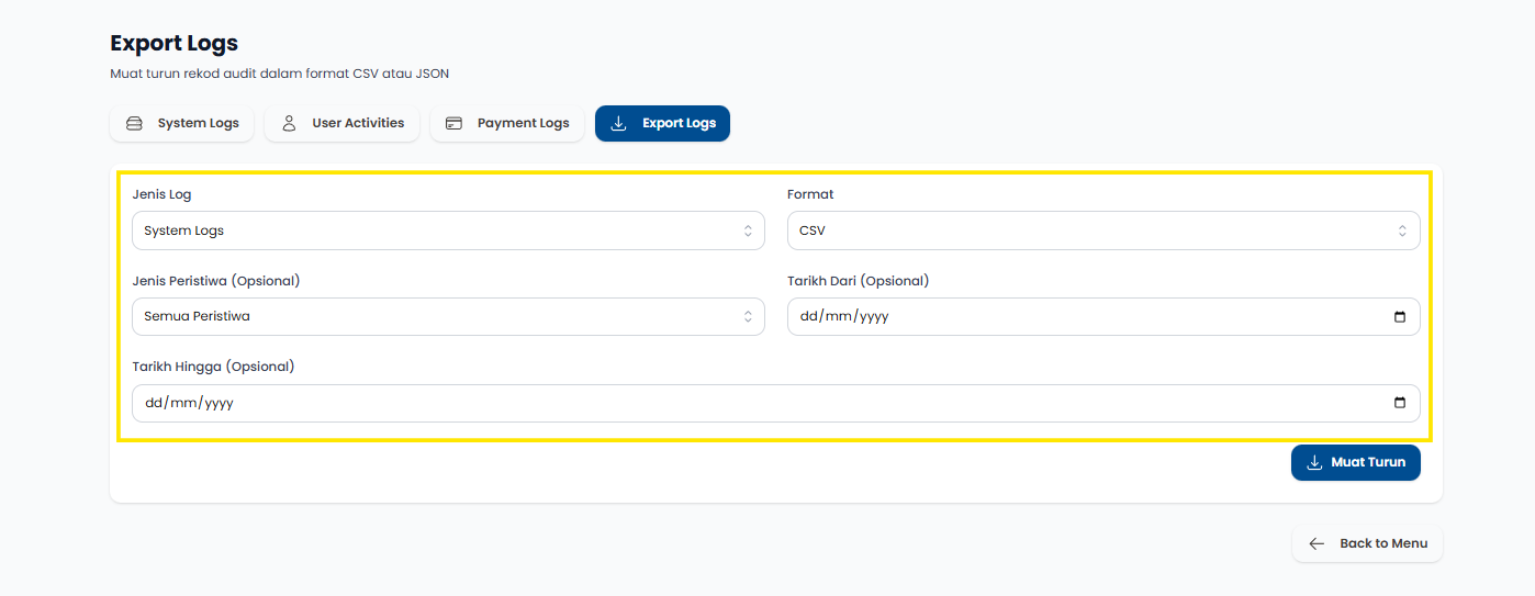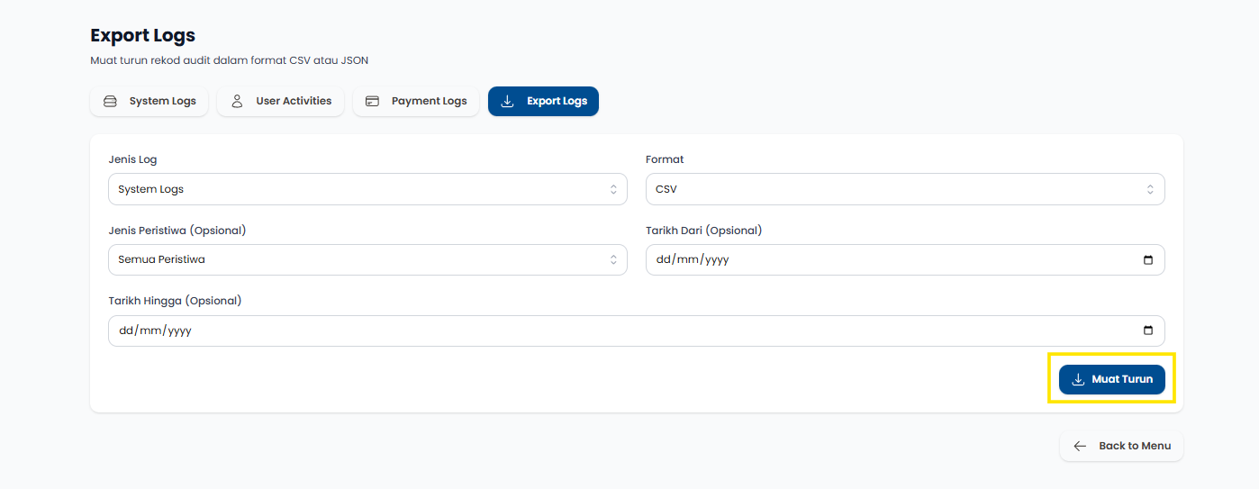 Langkah 1: Klik Export Logs untuk memuat naik dokumen laporan.